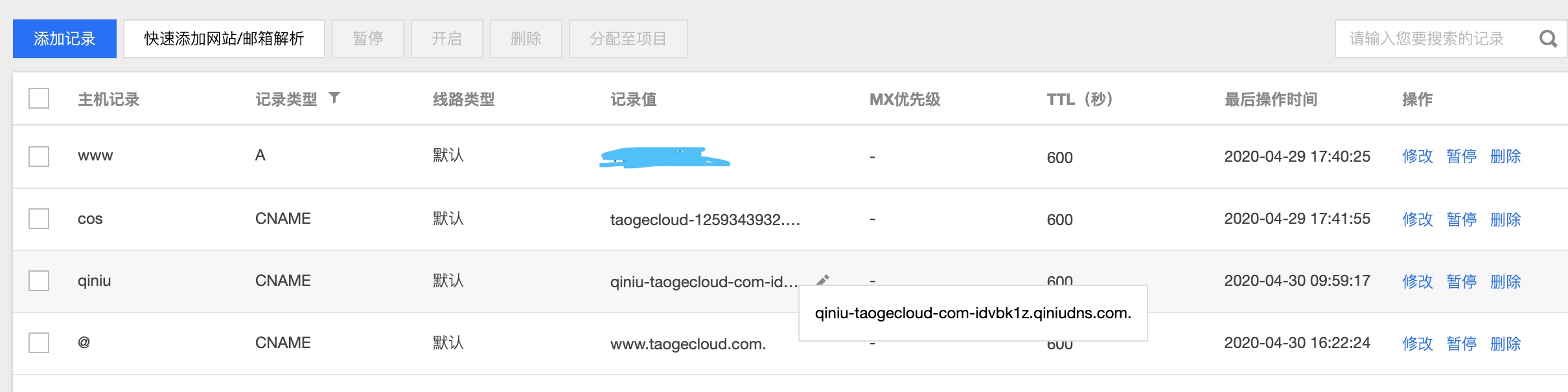 首先在腾讯云taogeshare.com域名下,创建[www] A记录对应到云主机CVM的IP地址解析,让外界能够访问到taogeshare.com和www.taogeshare.com。 也可以用[*]表示泛化解析,任何以taogeshare.com结束的域名访问都指向www.taogeshare.com,避免输错了网址或二级域名导致解析不到网站。