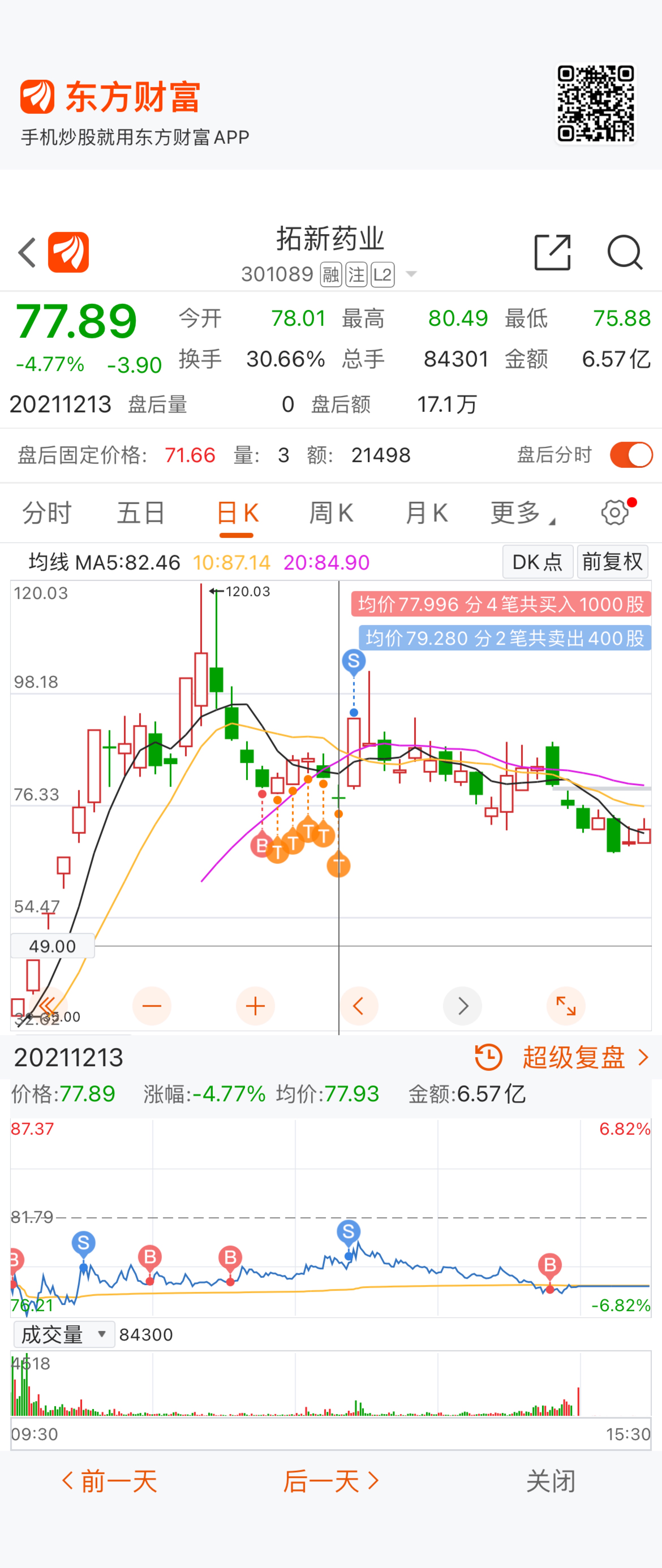 而当九安继续跨年这波行情向上攻的过程中,拓新药业开始回调,这就形成了性价比优势,九安买不进或者恐高,就来找低位,自然就是拓新药业。按照7日模型可以在图中滚动区域给一些仓位滚动做T对抗。这个位置的经验就是,一旦向上攻不上去,马上向下回砸,跌破平台就是机会,有同为疫情板块的九安高高在上,拓新作为创业板龙头,九安之前行情的由拓新带动,此时超跌了,资金自然就来了。