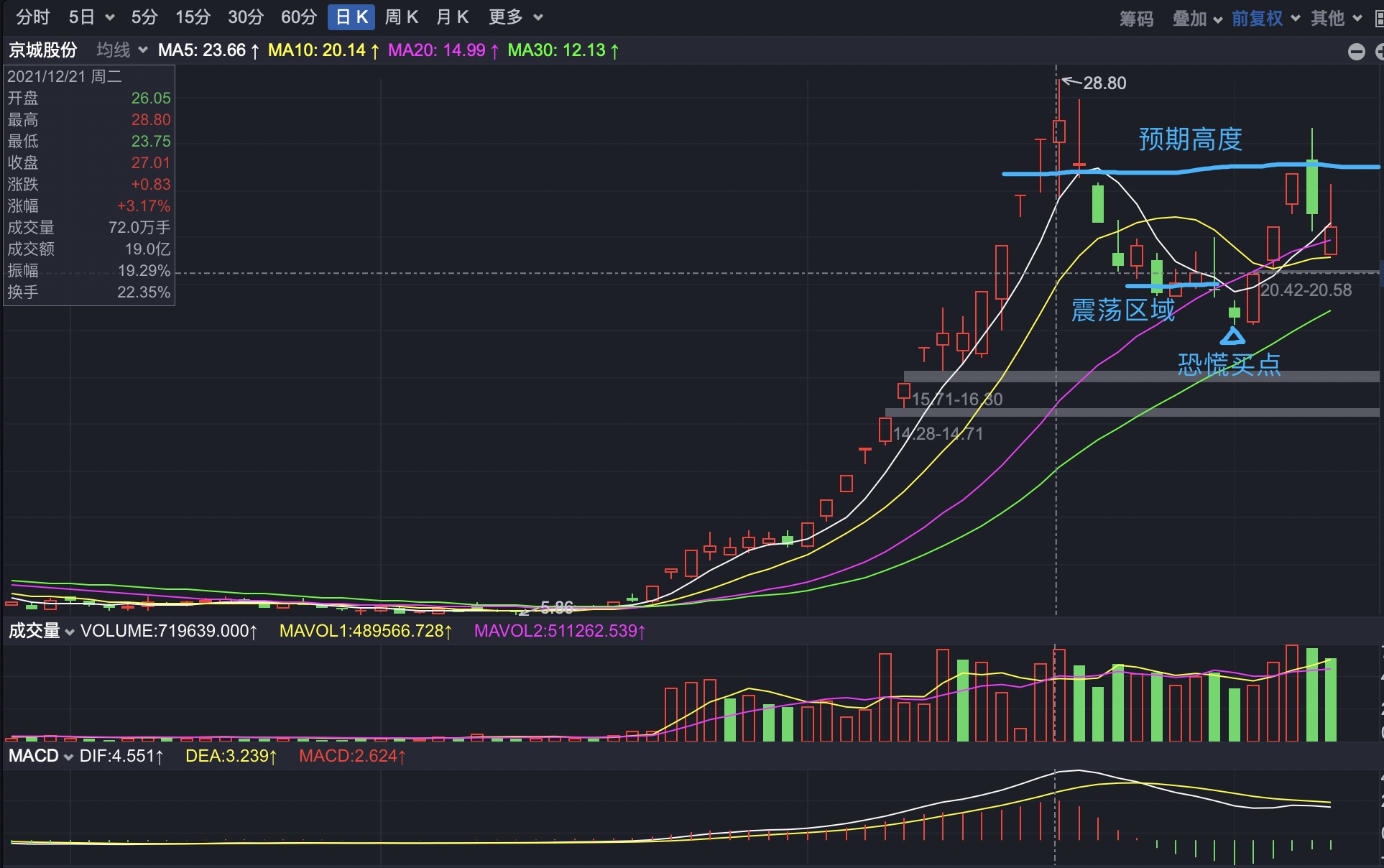 3、符合总龙头7日调整的模型,并且此时三大跨年妖股,只有京城调整到位,自然有资金来,可以给仓位。