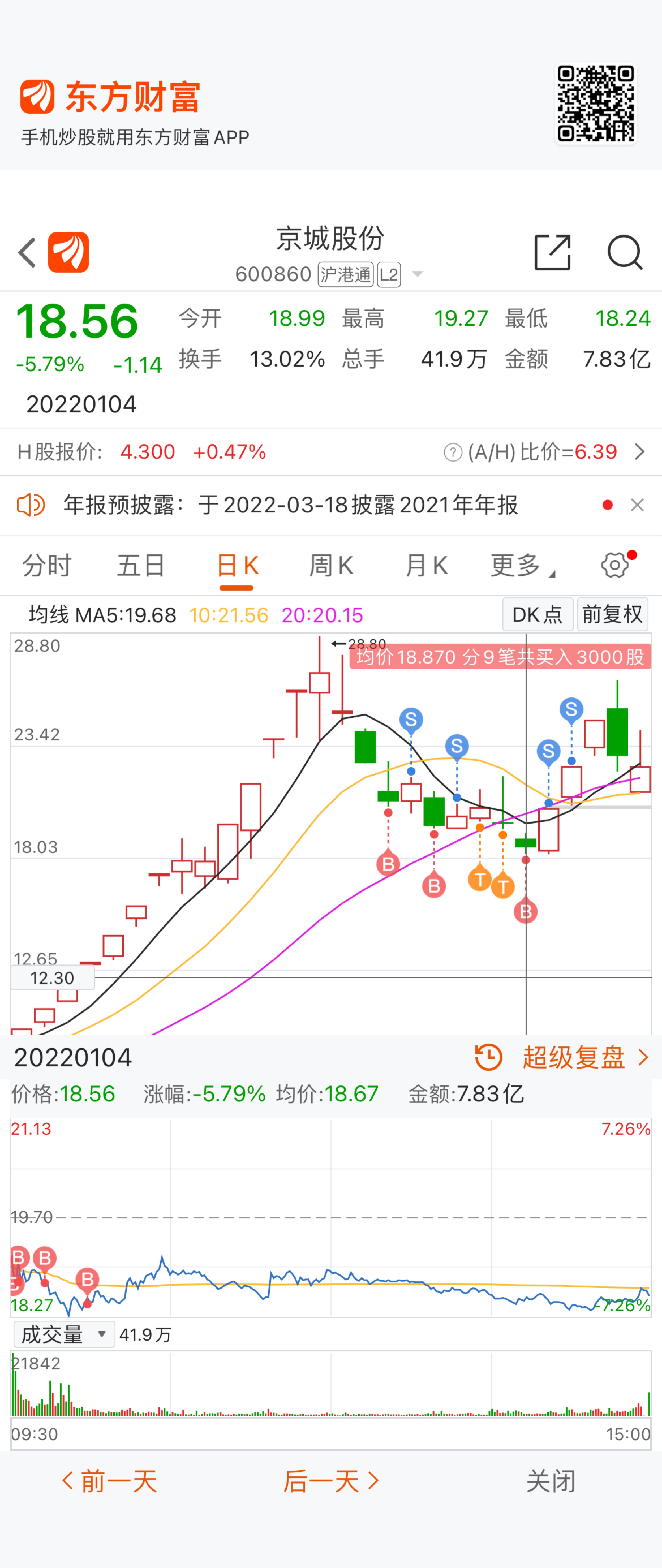 4、次日果然破平台,恐慌买点就是大崩之后,跌破了震荡区域,并且形成十字星线,十字星线的特点就在于早盘和尾盘都有差不多接近的买点,要不然怎么形成十字星线!在这一日在早盘-5%-7%的区域,果断重仓,至完成15w仓位!
