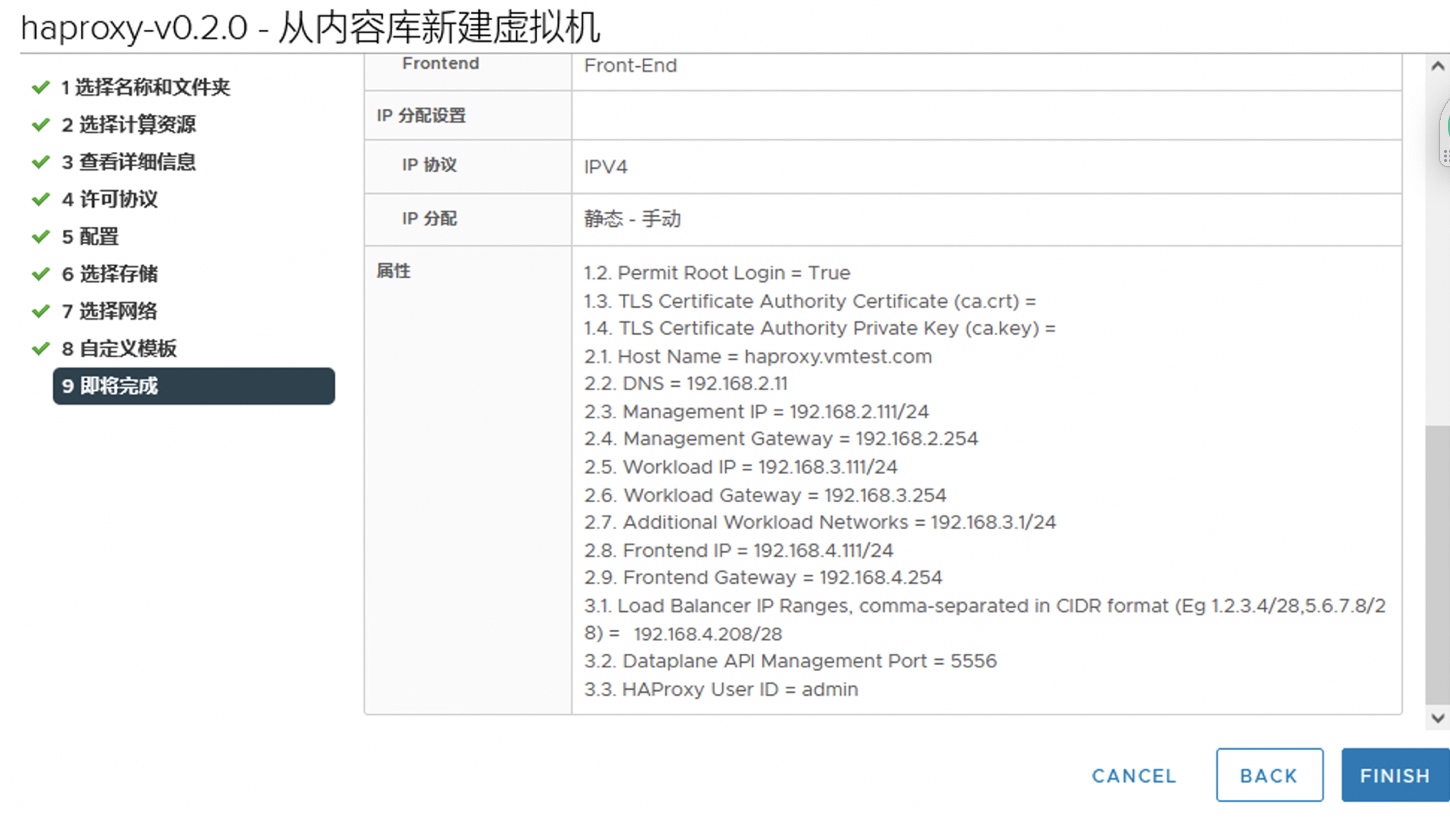 HAProxy横跨在三个网络上。确保能被VC管理和调度服务,也能确保运行在Workload网段的TKG Cluster的Master和Nodes能够通过HAProxy的Frontent网络对暴露服务。