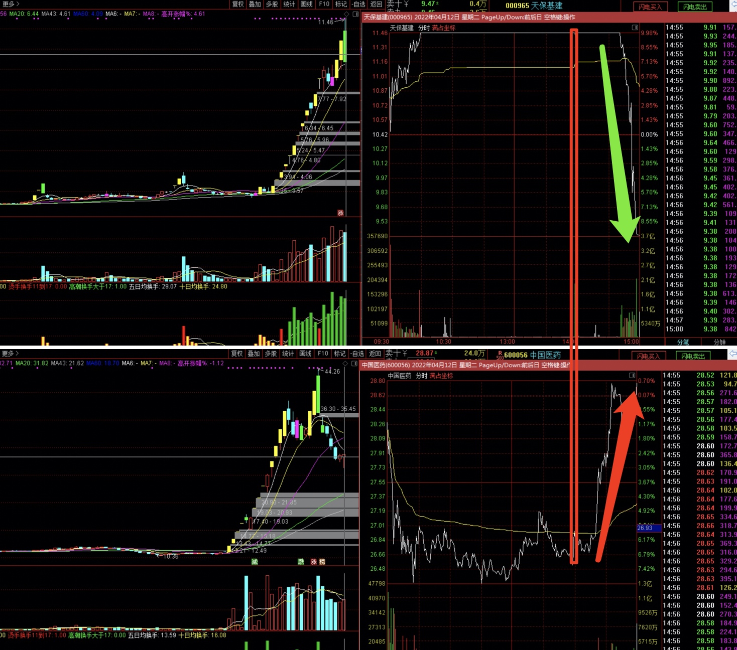 4.12日,这一日天保基建破板,买入策略就是高低切低吸老龙头!2:01猛干中国医药,为什么不能浙江建投呢,因为建投距离天保基建太远了。