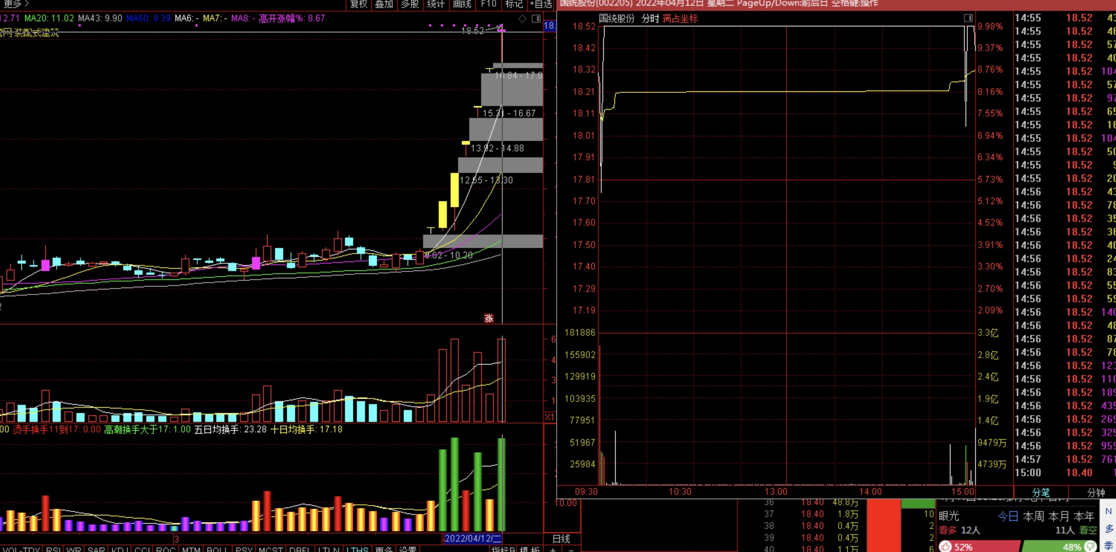 2、市场上其他的题材怎么样?水泥+基建+海南题材的海南瑞泽,是全场仅次于国统的高度,开盘躺板板,4.12日地天板的4板水泥,宁波富达尾盘被核,4.13早上继续被核。说明基建退场。
